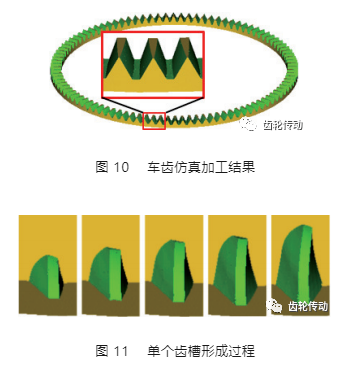 仿真得到工件單個齒槽成型過程如圖 10 所示。刀具切削刃切入工件后,刀具與工件開始進行空間展成切削,單個齒槽的切削成型過程如圖 11 所示。可以看出,刀具和工件展成運動形成工件齒槽的全過程,刀具的切入刃、頂刃與切出刃從切入到切出的過程中,形成工件齒槽的左右齒面并不相同,切出刃相較于切入刃更早地加工出面齒輪齒形。