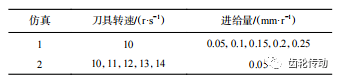 切削力影響因素分析:選擇 2 個對切削力有顯著影響的工藝參數,即刀具轉速和刀具進給量。通過單因素試驗,研究了 2 種工藝參數對切削力的影響,仿真參數如表 2 所示,其中,刀具進給量為車齒加工時工件每轉過一周時刀具沿工件徑向的進給量。
