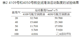 4109 號 和4050 號航空潤滑油運動黏度的試驗結果如表 2所示。