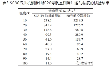 SC30 汽油機潤滑油和20號航空潤滑油運動黏度的試驗結果如表 3所示。