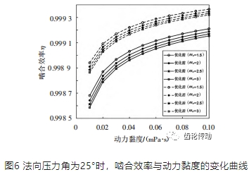 2)當潤滑油的壓力增大時,分子間的距離縮短,吸引力增大,所以潤滑油的黏度會升高,導致齒輪嚙合摩擦因數減小,使得滑動摩擦損失降低,導致齒輪的嚙合效率增大;