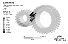 本文研究的電動汽車減速器采用兩級斜齒輪傳動,由于輸入級齒對與輸出級齒對在預測疲勞壽命時方法一樣,且輸入級作為高速級,故本文以輸入級齒對進行建模分析。根據齒輪參數在Solidworks中建立減速器齒輪對模型,將模型進行簡化處理后導入ANSYS/Workbench中,按照ANSYS數值模擬分析流程對齒輪對進行分析,其中,在施加約束與載荷時利用 ANSYS/Workbench瞬態分析模塊對主從動齒輪內徑圓面添加轉動副,并在主動齒輪上施加轉矩,在從動齒輪上施加轉角,最后得到齒輪對的應力云圖,如圖7所示。