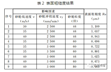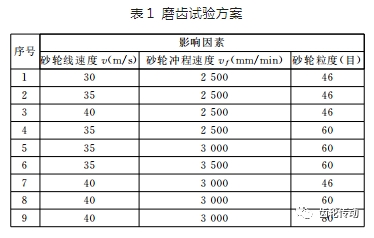 磨齒試驗方案:根據實際加工情況,本次試驗的影響因素設置如下:砂輪線速度v 分別取30m/s、35m/s、40m/s;砂輪沖程速度vf 分別取2500mm/min、3000mm/min、 3500mm/min;砂輪粒度分別取46目、60目、80目。對3個影響因素進行試驗設計,試驗方案見表1。