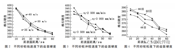 由圖 2~ 圖 4 可以看出:齒面硬度在 HV354~ HV398范圍內變化,并且隨著與表面距離的變大而減小,與砂輪線速度v、砂輪沖程速度vf、砂輪粒度并無明顯的變化相關規律。這是由于磨削加工會使零件表面發生塑性應變,產生加工硬化現象,從試驗結果中可以看出硬化層深度大概在50μm~55μm 左右,硬化層的硬度大于基體的硬度,硬化程度約為11%左右。硬度測試結果也未發現有硬度異常的點,說明該次試驗齒面磨削沒有出現磨削燒傷而導致硬度降低的情況。