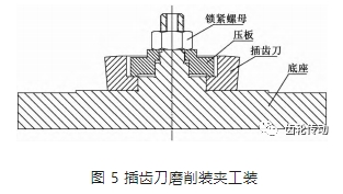 為提高插齒刀刃磨精度,對插齒刀刃磨方式進行改進。根據插齒刀磨削原理,制作一套組合工裝用于立式 MX2000 數控外圓磨床進行濕磨插齒刀。針對插齒特點,設計插齒刀裝夾刀桿孔為基準的裝夾工裝,工裝由底座、壓板、鎖緊螺母三部分組成(見圖 5) ,采用插齒刀內孔及端面定位、螺栓把合壓緊裝夾方式,插齒刀裝夾定位底面與底座裝夾基準面貼合。