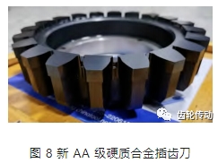 方案中為減小刀具齒形誤差,通過對插齒刀分度圓壓力角進行修正,使刀具切削刃投影在分度圓處的切線和理論漸開線的切線重合,修正后的插齒刀刀刃水平投影與理論漸開線在分度圓處相切,將前刀面﹣5°負前角帶來的刀具齒廓漸開線構形誤差降低到最小。通過反復試驗研究,對硬質合金插齒刀刀片材質進行改進升級,采用耐磨性和抗沖擊性能更好的材料和熱處理方案,研制出新型 AA 級硬質合金插齒刀(見圖 8) 。