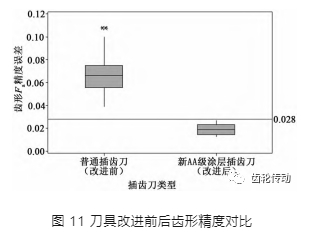 通過改進前后的三坐標數據對比,并利用箱線圖分析得出(如圖 11) : 刀具精度和耐磨性對齒形精度影響最大。改進前采用普通硬質合金插齒刀加工,齒形誤差在 0.05 ~ 0.08 mm 范圍波動,不滿足圖紙 7 級精度要求( Fa≤0.028) ; 改進后采用更加耐磨的 AA 級涂層插齒刀,齒形誤差達到圖紙 7 級精度要求。