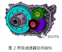 通過采用細高齒技術方案,優化齒輪齒廓參數,可以增加齒輪嚙合重合度,從而提高齒輪承載能力和使用壽命,實現減振降噪、降低成本的目的。齒輪材料選用滲碳鋼 20MnCr5,后期噴丸處理。圖 2 是減速器傳動結構圖,輸入軸為電機轉軸,輸出軸接車輪。