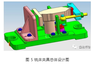 該夾具主要是確定定位:底面是采用兩個支承板,限定了三個自由度,Y 和 Z 方向的旋轉,X 方向的移動,右面Φ32mm 圓柱端面用一個支承釘限定一個 Y 方向的移動自由度,頂面用 V 型塊限定 Z 方向的移動和 X 方向的旋轉自由度,這樣就限定了六個自由度,滿足了六點定位原理,工件在夾具中合理定位;再就是夾緊,選擇兩個側面面作為夾緊面,采用鉸鏈機構,螺釘和壓板夾緊,可人為的調緊調松,用 V 形塊壓板夾緊頂端圓弧部分,選擇輔助支撐用來減少加工時工件的震動,確保夾緊機構夾緊可靠。詳細如圖 5 所示。