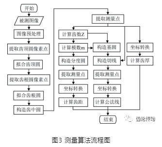 完成齒輪圖像的預處理后,基本上得到了齒輪的內外輪廓,如何從外輪廓像素中提取出有用特征,是最終實現齒輪幾何參數自動化測量的關鍵。本文以小模數圓柱直齒輪的齒距、齒厚和公法線長度3個重要的齒輪制造精度控制參數的自動測量為例,設計了機器視覺測量算法,具體流程圖如圖3所示。