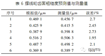由表 6 可知,擺線輪齒面表面粗糙度預測值和實測值之間的相對誤差在 1. 95% ~ 5. 1%之間,最大相對誤差為 5. 1%,說明文中的擺線輪齒面磨削表面粗糙度的預測模型具有良好的預測效果。因此本文作者建立的表面粗糙度預測模型可為分析擺線輪齒面精密加工表面質量提供一定的理論參考。