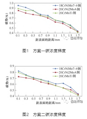 (1)碳濃度梯度結果 采用方案一滲碳處理后,3種材料碳濃度梯度結果如圖1所示;采用方案二滲碳處理后,3種材料碳濃度梯度結果如圖2 所示。
