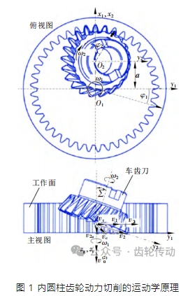 刮齒是通用齒輪制造中的一種連續(xù)切削方法。在這種制造技術(shù)中,它與一般的車刀和刮刀不同。切削過程是由刀具與工件之間的相對速度引起的。刀具相對于工件放置在橫軸角度上,類似于剃須過程,并且刮齒動作是由刀具和工件之間的相對速度引起的。相對于內(nèi)齒輪的刮削刀具的幾何結(jié)構(gòu)如圖 1 所示。將笛卡爾坐標系 S1(O1-x1y1z1)和 S2(O2-x2y2z2)分別假設為工件和刮齒刀的運動坐標系,且工件與刮齒刀之間為剛性連接。在圖 1 主視圖中可以得出,內(nèi)齒輪在 S1 坐標系中進行定位,其旋轉(zhuǎn)軸與 z1 共線。而刮齒刀則在 S2 坐標系中進行定位,其旋轉(zhuǎn)軸與 z2 共線。刀具中心通過矢量距離 a 定位在 xy 平面中心,齒輪和刀具的節(jié)距圓在圓周的最低點進行切向接觸。同樣,在圖 1 俯視圖中對工件軸和刮齒刀軸構(gòu)成的刀具工作角度進行了示意。以直齒輪為例,軸向進給速度 v(2)0 與 z1 共線,假設工件運動角速度和刀具運動角速度分別為 ω1 和 ω2。隨著軸向進給 v(2)0開始,工件繞 z1 旋轉(zhuǎn) φ1,刀具繞 z2 旋轉(zhuǎn) φ2。在滾動刮齒過程中,利用工件和刮齒刀具相對運動使得切削速度 vc 形成定位約束。如圖 1 所示,刀具速度 v2 被劃分為軸向速度 v2a 和切向速度 v2t。然后,切向速度 v2t 和工件運動速度 v1 耦合得到切向速度 vt。因此,切削速度 vc 由軸向速度 v2a 和切向速度 vt 引起。在加工斜齒輪的情況下,行程運動中取 z1 軸方向作為進給方向,但增量角速度 Δω1 依賴于軸向進給,必須添加到 ω1。工件的增量角速度 Δω1為: