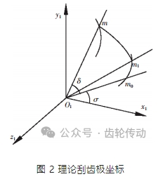 如圖 2 所示,在工件坐標系 S1(O1-x1y1z1)中,理論刮齒曲線的極坐標為: