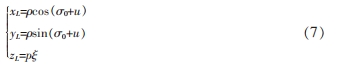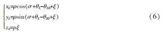 假設理論刮齒面上刮齒邊緣存在某一特定的點 m0 的極徑為 ρ0,進給極角為 θL0,ρ0 與刮齒刀坐標系 S2(O2-x2y2z2)中 x2 軸的夾角為 σ;刮齒邊緣其余任意一點 m1 的極徑為 ρ,進給極角為 θL,則∠(ρ,ρ0)=θL-θL0,且∠(ρ,x2)=σ+θL-θL0。隨著刮齒刀運動轉(zhuǎn)角為 ξ 時,刮齒刀自身相當于沿 z1 方向移動 pξ,因此,理論刮齒面參數(shù)方程描述為: