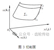 根據(jù)刮齒加工過程,若干次切削共同作用完成工件加工齒面。刮齒刀在每次切削進程中都會在 S1(O1- x1 y1 z1)下形成一個空間曲面∑1,如圖 3 所示。C1 表示 t1 時刻的切削刃,基于空間運動學原理,可得刀刃切削面方程: