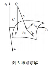 為提高計算效率,擬采用離散網(wǎng)格+跟蹤法對工件任一點與理論刮齒面之間的距離 lc 進行計算。根據(jù)求解出的初始點找出 lc。如圖 5 所示,假設任一點為 Q,對應理論刮齒面上的點為 p,點 p 在進行加工之前初始位置為 p0,Q 到 p 和 p0 的方向矢量定義為 U 和 S。由式(7)得到點 p0 在 S 和 U 兩個方向矢量上的偏導數(shù) rLρ 和 rLξ。對矢量 S分別在U,rLρ 和 rLξ 三個方向上進行分解,可以描述為: