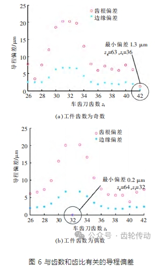 此外,如果刮齒刀齒數(shù)約為工件齒數(shù)的一半,除去齒數(shù)均勻,齒比恰好為 1/2 的情況,導程偏差大于其他情況。當工件齒數(shù)為奇數(shù)時,如圖 6a 所示,刮齒刀齒數(shù) 為 30,31,32,33 時,導程偏差最大,達到了 20.2 μm。