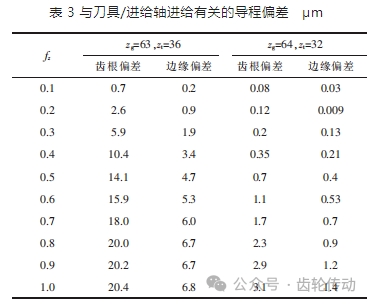 適當減少每個齒輪的軸向進給可以進一步減少進給誤差的深度。與刮齒刀軸向進給相關(guān)的導程偏差如表 3 和圖 7 所示。隨著軸向進給量的增加,導程偏差會逐步增大。例如當 fz=0.5 mm/r,zg=63,zt=36 時,工件齒輪導程偏差為 0.7 μm。然而當 fz=0.5 mm/r,zg=64,zt=32 時,工件齒輪導程偏差為 0.7 μm。因此,齒側(cè)進給量偏差與齒比有關(guān)。對于具有最大公約數(shù)的工件和刮齒刀的齒數(shù),為了提高加工效率,需要提高軸向進給量。如果工件齒數(shù)與刮齒刀齒數(shù)不匹配,則必須選擇軸向進給,直至導程偏差滿足加工要求。然而,如果軸向進給量過小,導致刮齒刀運動與切削方向相反,則會增加刮齒循環(huán)時間。