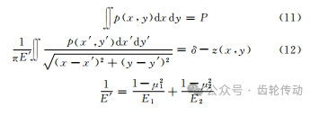 式中,E′為綜合彈性模量;E1、μ1 分別為擺線齒輪的彈性模量和泊松比;E2、μ2 分別為針齒的彈性模量和泊松比;z(x,y)表示接觸區(qū)域表面幾何函數(shù)。