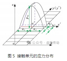 基于對線接觸問題的理解,將齒寬沿著接觸方向劃分為 N 個(gè)單元,如圖5所示。設(shè)p0j 為單元j中心的最大接觸應(yīng)力,2aj 為接觸單元的寬度,2hj 為接觸單元的高度,則