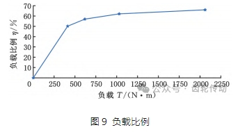 在同一位置,當(dāng)負(fù)載T1 為412N·m時(shí),擺線齒輪的4號齒到7號齒承受50.14% 的負(fù)載T1;當(dāng)負(fù)載T2 為618N·m時(shí),擺線齒輪的4號齒到8號齒承受57% 的負(fù)載T2;當(dāng)負(fù)載T3 為1030N·m 時(shí),擺線齒輪的4號齒到9號齒承受62.1% 的負(fù)載T3;當(dāng)負(fù)載T4 為2060N·m 時(shí),擺線齒輪的4 號齒到10號齒承受66.02% 的負(fù)載 T4。這說明擺線齒輪拐點(diǎn)附近承受著大部分負(fù)載,約35% 參與嚙合齒數(shù)承擔(dān)著58% 的負(fù)載。同時(shí)說明隨著負(fù)載的增大,擺線齒輪拐點(diǎn)附近的齒所承受的負(fù)載比例也在逐步增加,但隨著負(fù)載的增大,接觸齒所承受的負(fù)載比例η的變化趨勢逐漸緩慢,如圖9 所示。