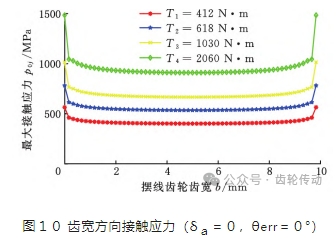 接觸寬度的零點(diǎn)位置在x =0的截面上,處于接觸區(qū)域的中間,接觸寬度的零點(diǎn)對應(yīng)分布接觸應(yīng)力的最高值。這個(gè)截面上的應(yīng)力分布如圖10所示,兩旁的應(yīng)力分布符合式(13)。由于針齒未修形,因此齒寬兩邊的接觸寬度aj 沒有明顯的閉合趨勢,反而隨著載荷的增大,兩邊的接觸寬度 aj 有增大趨勢。在指定載荷下,如果修形量適當(dāng)增大,齒寬兩邊的接觸寬度aj 會產(chǎn)生閉合,以減少齒面兩端的應(yīng)力集中;若修形量過大,雖然齒寬兩邊的接觸寬度aj 閉合,但會導(dǎo)致接觸區(qū)域減小,繼而使得齒寬中部的接觸應(yīng)力過大,并加速齒面疲勞。修形量應(yīng)根據(jù)實(shí)際工況及安裝誤差等條件選取。