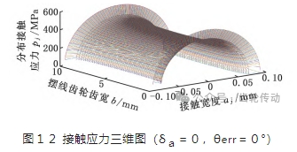 為直觀地查看接觸應(yīng)力的變化,將負(fù)載為412N·m 情況下的接觸應(yīng)力分布轉(zhuǎn)化為三維,如圖12所示。