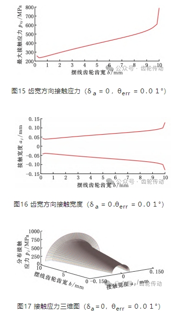 (4)利用力平衡方程和變形協(xié)調(diào)方程建立擺線齒輪齒寬方向的接觸應(yīng)力數(shù)學(xué)模型,給出了其求解步驟及計(jì)算流程圖,該方法可以分析不同載荷、安裝誤差及修緣量下擺線齒輪周向及軸向的接觸應(yīng)力分布及接觸寬度分布。
