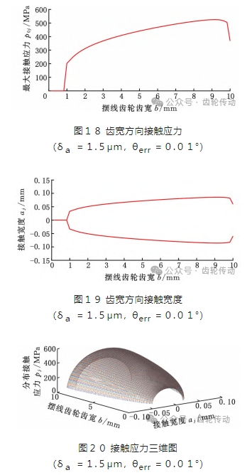 由圖18~ 圖20可以看出,當(dāng)擺線齒輪沿著軸向方向傾斜0.01°時(shí),擺線齒輪無齒向修緣,針齒修緣后,雖然擺線齒輪齒寬方向的接觸長度隨之減小,但是擺線齒輪兩邊的邊緣接觸現(xiàn)象消失。接觸區(qū)域的寬度aj分布較修緣之前的寬度分布變得更加均勻,在接觸區(qū)域的左邊,接觸寬度 aj沿著偏載方向從零逐漸增大,在接觸區(qū)域的右邊沒有產(chǎn)生閉合,但是接觸寬度aj有減小的趨勢。擺線齒輪齒寬接觸應(yīng)力分布沿著偏載方向緩和過渡,在一定程度上延長了擺線齒輪的齒面壽命,這說明針齒修緣對擺線齒輪的安裝偏差有一定的適應(yīng)性。