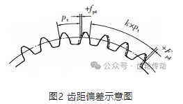 齒輪齒距偏差的存在會使齒輪在傳動中產生振動、沖擊和噪聲,影響了齒輪傳動的平穩性,因此在齒輪的精度等級評定時還需考慮齒距偏差的大小,GB/T 10095.1—2008中的齒距偏差有3種,分別為單個齒距偏差、齒距累積偏差和齒距累積總偏差。齒距偏差示意圖如圖2所示,圖中實線為實際齒廓,虛線為理想齒廓,pt 為單個理論齒距pt =πd/z。單個齒距偏差fpt為在齒輪的分度圓上任意兩個相鄰同側齒廓的實際齒距與理論齒距之差。齒距累積偏差Fpk為任意 k+1個同側齒廓的實際齒距與理論齒距之差,理論上齒距累積偏差Fpk等于k個單個齒距偏差之和,k可從1取到齒數z。在任意齒距累積偏差中的最大齒距累積偏差為齒距累積總偏差Fp。