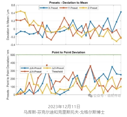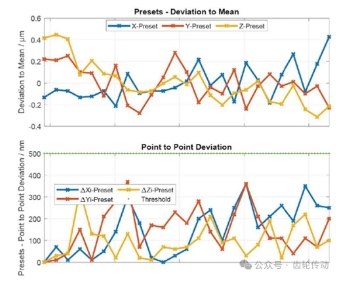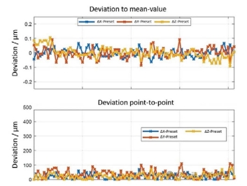 圖4 使用Klingelnberg Hybrid P 26 的光學(xué)傳感器在生產(chǎn)車間中進(jìn)行n = 100 次測(cè)量的預(yù)設(shè)研究。頂部的圖顯示了每個(gè)軸(xyz)與平均值的偏差,底部的圖顯示了顯示測(cè)量之間的變化。