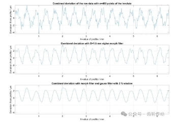 圖1 頂部的行顯示了齒輪輪廓6.5毫米滾動(dòng)路徑上的480個(gè)數(shù)據(jù)點(diǎn)的模擬輪廓偏差。中間的行顯示了使用1.5毫米觸筆的形態(tài)濾波器的影響。底部的行顯示應(yīng)用高斯濾波器(3%窗口)的數(shù)據(jù)。