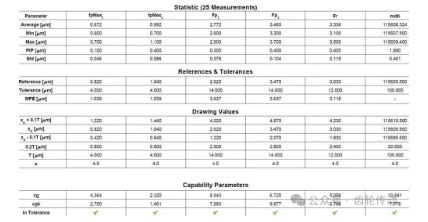 圖5 對(duì)n = 25 次測(cè)量的1類研究進(jìn)行統(tǒng)計(jì)分析,顯示所有指數(shù)特征的Cg和Cgk值均顯著大于1.33的目標(biāo),表明測(cè)量工具功能強(qiáng)大。在生產(chǎn)環(huán)境中使用Klingelnberg Hybrid P 26 的光學(xué)傳感器進(jìn)行測(cè)量。