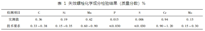 為確定失效螺栓元素含量是否合格,從螺栓取樣進行化學成分分析,檢驗結果如表 1 所示。可見失效螺栓元素含量符合 JISG 4053—2008《機械構造用合金鋼》中對 SCM435 化學成分的要求。