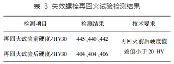 按 GB / T 3098. 1—2010《緊固件機械性能螺栓、螺釘和螺柱》中規定的試驗方法對失效螺栓進行再回火試驗,工藝參考客戶提供的《螺栓熱處理工藝卡》,回火溫度(460 ± 10)℃ ,保溫時間(60 ± 5)min。試驗前后同一區域硬度下降約40HV,結果不符合標準要求,如表 3 所示,說明失效螺栓在生產制造時存在回火不充分的現象,這也是心部硬度偏高的主要原因。