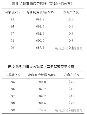 2)采用對數正態分布、二參數威布爾分布數據處理方法,對長壽命區的試驗數據進行了分析,試驗齒輪在可靠度為 99% 時,基于對數正態分布擬合齒輪齒根彎曲疲勞極限應力是 687.6 MPa,基于二參數威布爾分布齒輪齒根彎曲疲勞極限應力是 673.4 MPa;基于二參數威布爾分布得到的齒輪疲勞極限更保守。