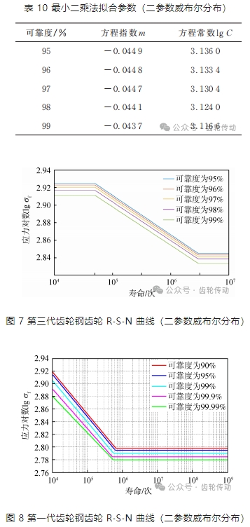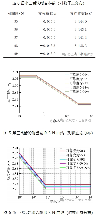 彎曲疲勞壽命 R?S?N 曲線擬合:對有限壽命區的試驗結果表 4 進行數據分析,95% 置信度下,采用對數正態分布和二參數威布爾分布進行擬合,分析在置信度為 95% 下的不同可靠度的 R ?S?N 曲線,最終得到第三代齒輪鋼齒輪的 R?S?N 曲線。