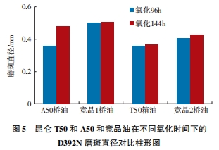 從圖 4 中可以看出,在兩種油品不同氧化時間下,昆侖 T50 與競品 2 相比,試驗件表面同樣表現出較少的犁溝,說明昆侖 T50 變速箱油的抗磨性能優于競品 2。昆侖 T50 和 A50 和競品油在不同氧化時間下的 D392N 磨斑直徑對比柱形圖見圖 5。