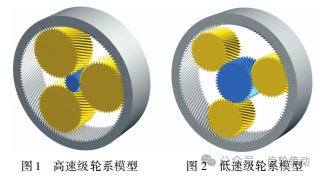 在 KISSsoft 軟件中利用配齒所選擇的數(shù)據(jù),對輪系模型進(jìn)行創(chuàng)建,并定義潤滑方式為滑脂潤滑,潤滑脂牌號:Interflon Food Lube PN 32。該行星輪系是典型的 NGW 結(jié)構(gòu),采用內(nèi)齒圈固定、行星架約束、太陽輪浮動的方式達(dá)到傳輸?shù)臏?zhǔn)確性和承載的均勻性。高速級、低速級模型如圖 1—2 所示。