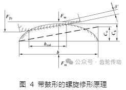 圖 4 所示為帶鼓形的螺旋線修形原理,其中:Cα 為螺旋修形量;Fβy為嚙合歪斜度;bcal為嚙合有效齒寬;Ch 為鼓形修形量;δ′為接觸變形量。