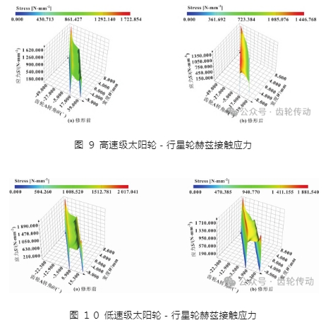 修形前后的赫茲接觸應(yīng)力云圖如圖 9、10 所示。可以看出:修形前存在應(yīng)力集中現(xiàn)象,修形后的齒面應(yīng)力分布更加均勻,應(yīng)力明顯降低。輪齒載荷的均勻分布有利于齒輪傳動穩(wěn)定運(yùn)行,提高減速器整體壽命。