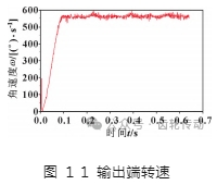 將修形前后的虛擬樣機(jī)導(dǎo)入 ADAMS 中進(jìn)行動力學(xué)仿真分析,驗證其模型的準(zhǔn)確性。設(shè)置太陽輪額定輸入為 3 000 r/ min,輸出軸設(shè)定為 120 N·m,利用 STEP 階躍函數(shù)來逐步加載。輸出端轉(zhuǎn)速如圖 11 所示,平均轉(zhuǎn)速為 522. 46 °/s,與理論計算值 562. 5 °/s 相差較小,驗證了模型的準(zhǔn)確性。