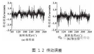 由圖 12 可知:修形前傳遞誤差峰峰值為 3. 84 arcmin,整體在-2. 5 ~ 2 arcmin 波動,修形后傳遞誤差峰峰值為 3. 1 arcmin,整體在- 1. 75 ~ 1. 75 arcmin 波動。帶鼓形的螺旋線修形使其傳動誤差上下峰差值由修形前的 3. 84 arcmin 降為 3. 1 arcmin,傳動誤差曲線峰值的下降,降低了整體輪系的噪聲,使輪系傳動更加平穩(wěn)。