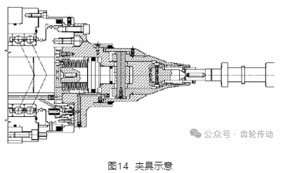 工裝夾具及輔助工裝的剛度也是決定磨齒燒傷的關鍵因素(圖14)。在磨削過程中,砂輪的瞬間進給使工件承擔很大的軸向力,砂輪的進給使工件處于不穩(wěn)定狀態(tài),導致設定的進給量的均勻性無法保證,從而大幅增加磨齒燒傷的概率。