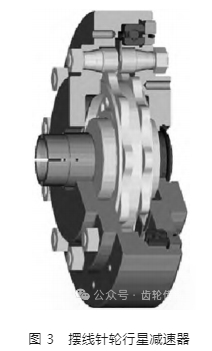 擺線針輪行星減速器是以應用行星式傳動為基礎、以擺線針齒嚙合為載體的傳動裝置,如圖 3 所示。與其他減速器結構類似,構成擺線針輪行星減速器主要分為輸入部分、減速部分和輸出部分。不同于其他減速器,擺線針輪行星減速器在輸入端設有一個雙偏心套,并在偏心套上配有兩個滾珠軸承,構成了該減速器的 H 機構,并以此為基礎組成了擺線針輪行星減速器種齒差為 1 的內嚙合減速結構。擺線針輪行星減速器承載能力大,因此被廣泛應用于如礦山、化工和起重等工程機械領域。