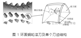 圖 1 是環面蝸輪滾刀及其單個刀齒的結構。環面蝸輪滾刀的刀齒主要包括側后角面、前刀面、刃帶面、刃口線和刃帶線。側后角面是刃帶線后面的部分,具有一定的側后角面角度 α。側后角 α 是向量 ns 與 nH 向量之間的夾角。其中 ns 是刃帶線上任一點 P1 在基本環面蝸桿螺旋面上的法矢量,nH 是點 P1 在側后角面上的法矢量。