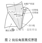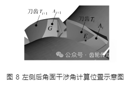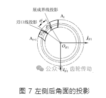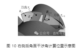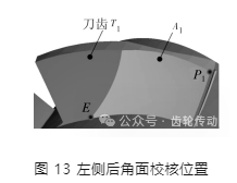 (1) 左側后角面入口第 1 個齒根處的 E 點,此點是展成齒頂的側刃帶 P1 點時產生的,如圖 13 所示。
