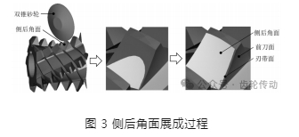 雙錐產形輪對每一個刀齒逐個磨削加工,磨削完成一個刀齒后,進行下一個刀齒的磨削加工,所有的側后角面構成不連續的分段曲面。在磨削側后角面的過程中,砂輪錐面沿刀齒的刃帶線移動,對刃帶線上的各點進行連續的磨削加工,整個加工過程是一種變傳動比的磨削過程,如圖 3 所示。從磨削過程中可看出,隨著砂輪錐面沿刃帶線運動,側后角面的范圍逐漸擴大,運動結束以后獲得刀齒的側后角面。對于每個刀齒的一側后角面,砂輪沿刃帶線運動,即可磨削出側后角面,該方法能夠保證側后角角度和刃帶面的寬度。