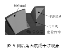 當增加刀齒的排數時,即增加刀齒密度,展成線可能會越過下一個刀齒的刃口線,從而破壞下一個刀齒的刃口線,出現展成干涉現象,如圖 5 所示。